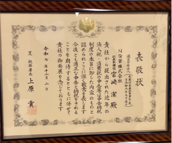 当社は令和7年12月2日に芝税務署より「優良申告法人」として表敬を受けましたことをご報告いたします。当社は昭和61年(1986年)から7回連続して優良申告法人に選定されております。 優良申告法人は、申告納税制度の趣旨に即した適正な申告と納税を継続し、他の納税者の模範としてふさわしいと認められた法人で、法人全体の1%未満と言われております。 今後も適正な会計及び税務処理に努め、社会的責任を果たしてまいります。
