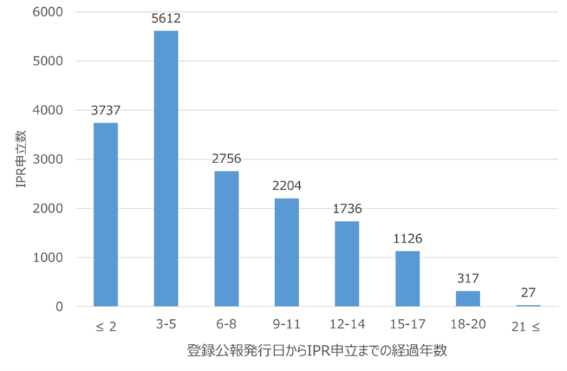 2012年以降に提出された17,515件のIPR申立のうち、8,166件は登録後6年以上の特許に対するものだった。 [7] IPRの対象となった特許の年齢分布を以下の図に示す。